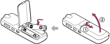 اسحب غطاء حجيرة البطارية وارفعه، ثم قم بإدخال بطاريتين قلويتين طراز LR03 (مقاس AAA) (مرفقة) أو بطاريتين NH-AAA قابلتين للشحن (غير مرفقة) بحيث تكون الاقطاب بالاتجاه الصحيح، وأغلق الغطاء.