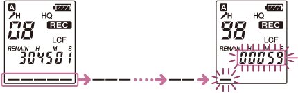 När återstående inspelningstid når 10 minuter blinkar den sista indikatorn. När den återstående tiden når 1 minut ändras räknarens teckenfönster automatiskt till att visa återstående tid och teckenfönstret för återstående inspelningstid blinkar också. Radera först några filer om du vill fortsätta att spela in.