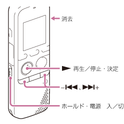 再生/停止・決定ボタンを押します。 - ひとつのファイルの一部分だけ消去するには、ファイル分割で消去する部分としない部分に分け、消去したい部分のファイル番号を選んで「ファイルを消去する」の手順3から手順5の操作をします。