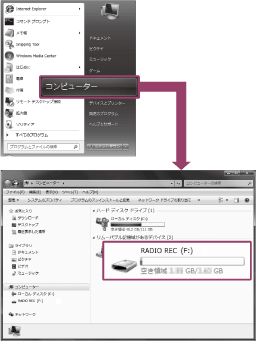- Windowsの[スタート]メニューから、[コンピューター](または[マイコンピュータ])をクリックし、[RADIO REC]→[FOR WINDOWS]をダブルクリックする。