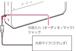 (外部入力)を選ぶ。 - 停止中に外部マイクを外部入力(オーディオ/マイク)ジャックにつなぐ。
