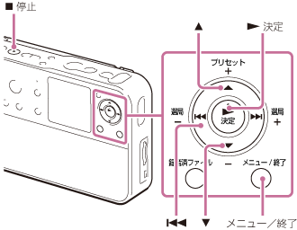 動作(ラジオまたはICレコーダー)モードによって表示されるメニュー項目が変わります。 - コントロールボタンの
