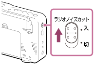 ラジオノイズカットスイッチを「入」の位置にスライドしてください。 ご注意 ラジオノイズカット機能は、ICレコーダーモードまたは、外部入力モードでは働きません。ラジオ受信時、ラジオ録音時にのみノイズカット機能が働きます。
