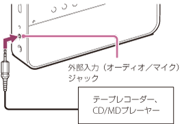 他の機器の音声出力端子(ステレオミニジャック)を別売のソニー製オーディオコードを使って、ポータブルラジオレコーダーの外部入力(オーディオ/マイク)ジャックにつなぎます。