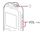 如果将耳机连接至(耳机)插孔,则可监听录音。 将耳机连接到(耳机)插孔。 按VOL -/+调节监听音量。 监听音量不影响录音电平。 注意 如果在监听过程中,耳机线触碰到IC录音机,IC录音机则可能录下沙沙的噪音。握住耳机线,使其远离IC录音机,可以减少沙沙的噪音。