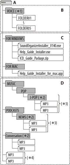 *3 IC录音机可识别传输到IC录音机上的多达8层的文件夹。