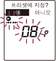 프리셋 번호, 주파수 및 "프리셋에 지정?"이 화면에 표시됩니다. - –