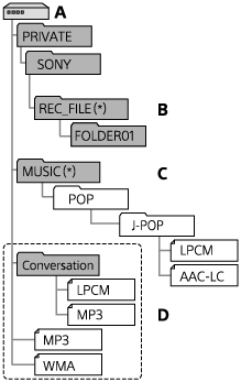 *2 Mappen som inneholder musikkfiler, vises med samme navn på IC-opptakeren. Det vil hjelpe deg å identifisere mapper hvis du navngir mapper med navn som er enkle å huske. Mappenavnene som vises i illustrasjonen ovenfor, er bare eksempler.