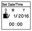Når du har fjernet batteriene fra rommet og satt dem inn igjen eller byttet ut batteriene med nye, vises Set Date/Time-skjermbildet i skjermvinduet. I dette skjermbildet ser du datoen og tidspunktet for den siste betjeningsoperasjonen du utførte med IC-opptakeren før du fjernet batteriene. Husk å endre dato og klokkeslett til gjeldende verdier.