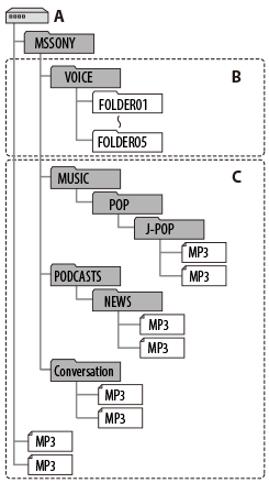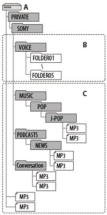 *2 سيتم عرض اسم المجلدات المخزنة فيها ملفات الموسيقى على شاشة مسجل IC كما هو، لذلك فإنه ملائم إذا استخدمت اسم يسهل تذكره للمجلد مسبقًا. المجلدات المبينة في الشكل التوضيحي هي أمثلة على أسماء المجلدات.