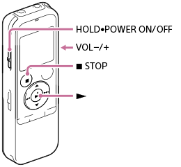 - Deslice el interruptor HOLD・POWER ON/OFF en el sentido de “POWER ON/OFF” para encender la grabadora IC o hacia el centro para anular el estado HOLD de la grabadora IC.