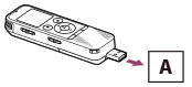 - Verschuif de USB-hendel op de achterkant van de IC-recorder en sluit de USB-aansluiting aan op de USB-netspanningsadapter.