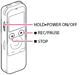 - Посуньте перемикач HOLD・POWER ON/OFF у напрямку «POWER ON/OFF», щоб увімкнути цифровий диктофон, або досередини, щоб скасувати стан HOLD цифрового диктофона.