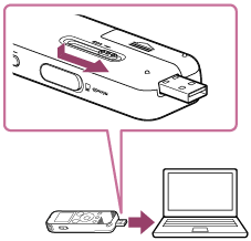 - اهرم لغزنده USB واقع در پشت ضبط کننده آی سی را فشار دهید و نگه دارید، و سپس برای بیرون آوردن رابط USB آن را به سمت فلش بلغزانید. رابط را وارد درگاه USB کامپیوتری که روشن و در حال کار است کنید.