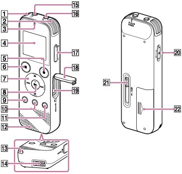 Orifício para correia (não é fornecida uma correia com o gravador de IC)