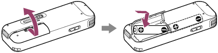 Здвиньте та встановіть кришку відсіку для батарей у напрямку стрілки, вставте лужні батарейки LR03 (розміру AAA), що входять до комплекту поставки, з дотриманням полярності, а потім закрийте кришку.