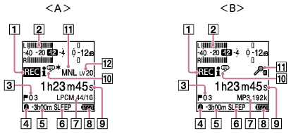 Rögzítés hangerőszintjének jelzője (csak manuális rögzítésnél van hatása.)