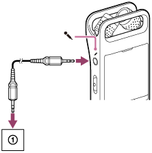 - Ha a bemenő hang nem elég hangos, a lineáris PCM felvevőt csatlakoztassa audio csatlakozókábellel a külső eszköz fejhallgató aljzatához (sztereo mini-jack), és szabályozza a külső eszköz hangerejét, miközben figyeli a rögzítési szint jelzőjének csúcsszintmérőit a lineáris PCM felvevő kijelzőjén. További információkért lásd: A csúcsszintmérő.