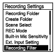 - Enquanto [Audio IN] estiver selecionado para [Ext. Input Setting], a função Recording Filter não funciona.
