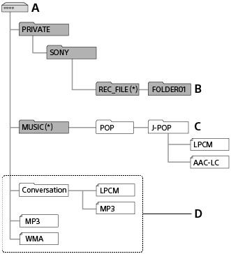*2 Папка с музыкальными файлами появится с тем же названием на вашей линейном PCM диктофоне. Присвоение папкам легко запоминающихся названий позволит легче идентифицировать папки. Названия папок, показанные на приведенном выше рисунке, являются только примерами.