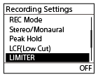 Vous pouvez activer la fonction LIMITER pour ajuster automatiquement le volume d’enregistrement des sons qui deviennent soudainement bruyants entrants pendant l’enregistrement afin d’éviter la distorsion des sons.