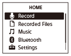 Меню HOME позволяет выбрать функцию, осуществить поиск записанных файлов или изменить настройки линейного PCM диктофона.
