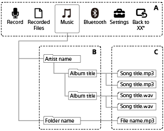 Приведенную ниже структуру папок и файлов можно просмотреть на линейном PCM диктофоне.