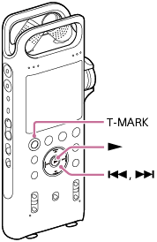 В то время как запись выполняется или приостановлена, либо воспроизведение выполняется или находится в режиме ожидания, нажмите T-MARK в точке, где нужно добавить маркер дорожки.