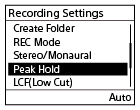 Settings] - [Recording Settings] - [Peak Hold] в меню HOME, а затем нажмите