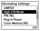 Если повысить громкость записи для источника звука невозможно, вы можете включить функцию High S/N Mode для подавления шума при записях с низкой громкостью.