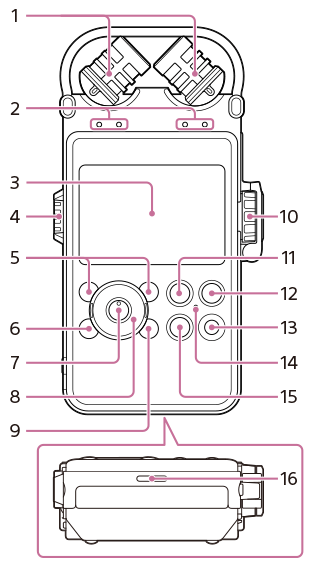 Ajústelo en MIC (micrófono) para grabar una entrada de señal de audio desde los micrófonos incorporados o un micrófono externo conectado a la toma MIC.