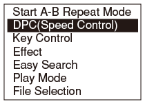 - En mode d’arrêt de lecture ou de lecture d’un fichier musical, appuyez sur la touche OPTION Pour afficher le menu OPTION, sélectionnez « DPC(Speed Control) », puis appuyez sur la touche