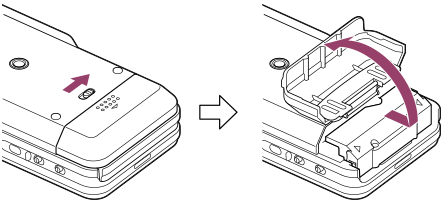 - Far scorrere la leva di blocco dello sportellino delle batterie sulla posizione “RELEASE” per rilasciare il blocco, quindi far scorrere lo sportellino dello scomparto batterie verso il basso per aprirlo.