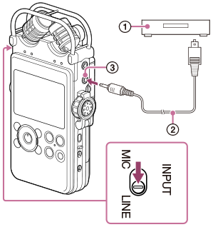- Eseguire l’operazione di registrazione in modo analogo a quando si utilizzano i microfoni incorporati per impostare il registratore PCM lineare sulla modalità di attesa della registrazione.