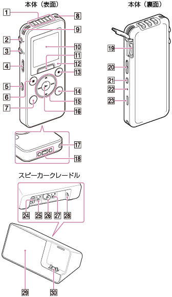 録音/一時停止ボタン - オプション/録音済ファイル(長押し)ボタン