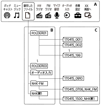 ポータブルラジオレコーダーで録音したファイルは、フォルダに保存されます。