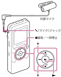 録音/一時停止ボタンを押す。内蔵マイクは自動的に切れ、外部マイクの音を録音します。