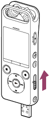 - Disconnect the IC recorder from the USB port of the computer, and slide the USB slide lever in the direction of the arrow to retract the USB connector.