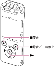 再生または停止中に録音ボタンを長押しすると、録音一時停止状態となります。