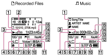 : nome do ficheiro: data de gravação_hora da gravação.formato do ficheiro (por exemplo, 161010_0706.mp3) Os ficheiros de música são indicados como se segue: