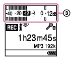 ) aparecem no visor para indicar os níveis do volume de gravação atual e ideal do som de entrada. Para obter mais informações sobre os medidores de nível máximo, consulte Sobre os medidores de nível máximo indicando os níveis de volume de gravação.