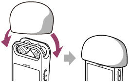 Quando utiliza o gravador de IC, coloque a proteção contra vento fornecida sobre os microfones incorporados para minimizar o ruído do vento.