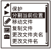 可在停止模式中分割文件,将文件分割成两部分,并将新的文件编号添加到分割文件的文件名中。通过分割文件,可以在长时间录音(如会议录音)时轻松找到想要播放的起点。可以分割文件,直至文件夹中的文件总数达到所允许的最大数为止。
