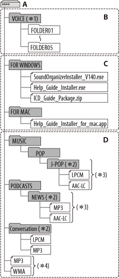 *3 O gravador de IC consegue reconhecer até 8 níveis de pastas transferidas para o gravador de IC.