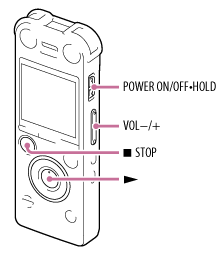 - Slide the POWER ON/OFF•HOLD switch in the direction of “POWER ON/OFF” to turn on the IC recorder, or towards the center to release the IC recorder from the HOLD status.