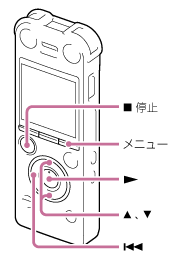 - このヘルプガイドで使っているイラストは、ICD-SX1000をベースにしています。イラストがお使いの機種とは異なる場合がありますが、操作に使用するボタンやスイッチなどは共通です。