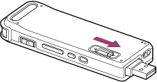IC 레코더 뒷면의 USB DIRECT 슬라이드 레버를 화살표 방향으로 밀면, USB 커넥터가 나타납니다. 그런 다음 USB 커넥터를 실행 중인 컴퓨터의 USB 포트에 삽입하십시오. (*1)