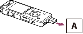 - IC 레코더 뒷면의 USB DIRECT 슬라이드 레버를 밀어 USB 커넥터를 USB AC 어댑터에 연결합니다.