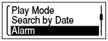 A la hora y fecha ajustada, la grabadora IC se enciende automáticamente y se muestra “ALARM” en el visor. A partir de ahí la alarma y el archivo seleccionado se reproducirán con el patrón de alarma que se haya elegido. Cuando finaliza la reproducción, la grabadora IC se detiene automáticamente. (La grabadora IC se detendrá al principio del archivo seleccionado.)