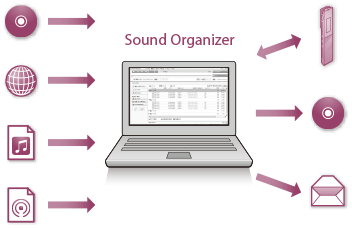 Sound Organizer به شما امکان می دهد که فایل ها را با استفاده از ضبط کننده آی سی تبادل کنید. صداهای وارد شده از CDهای موسیقی و سایر رسانه ها، MP3 و سایر فایل های صوتی وارد شده به یک کامپیوتر و پادکست ها نیز می توانند پخش شوند و به یک ضبط کننده آی سی منتقل گردند. عملکردهای گوناگونی می توانند برای فایل های وارد شده اجرا شوند، شامل پخش، ویرایش و تبدیل به MP3 و سایر فرمت ها. شما همچنین می توانید CD های موسیقی را که دوست دارید ایجاد کرده و فایل های صوتی را با ایمیل بفرستید.